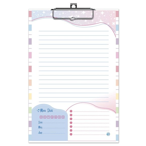 Prancheta plastificada, decorada, tem prendedor de metal com suporte retrátil para pendurar / Acompanha 24 folhas tamanho: 135mm x 215mm / Prancheta: 155mm x 230mm / Gramatura da folha: 75g/m²