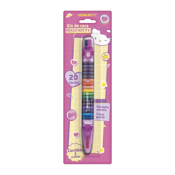 Pense na facilidade de poder levar 20 cores de giz de cera em apenas uma só caneta? Isso é o que acontece com o Giz de Cera Caneta Troca-ponta 20 Cores Hello Kitty Leo&Leo, muito prática, criativa e ainda ganha espaço no estojo para outros itens. São 20 pontas de giz de cera com cores diferentes que ficam na parte interna da caneta, protegidas por uma camada de espuma. É fácil de usar e retirar o giz tanto da ponta quanto da parte interna da caneta. Ainda vem com clip para prender em caderno e blocos. Produto Certificado INMETRO (Artigo Escolar/Segurança) – Registro 002075/2023