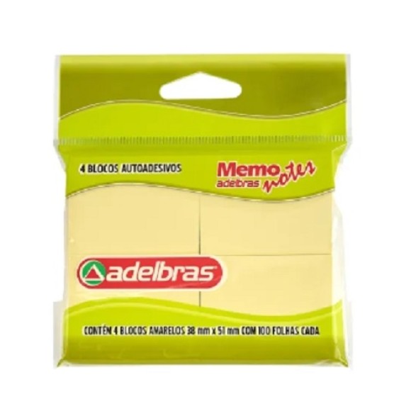Bloco de notas autoadesivas removíveis Adelbras / Utilizado para recados, anotações, marcações de livros, etc. / Pacote com 400fls (4 mini blocos com 100fls cada) / Medidas: 38mm x 51mm / Cor: Amarelo