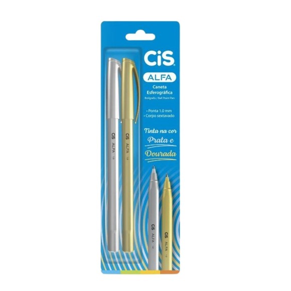 Caneta esferográfica / Ponta média 1.0mm / Corpo sextavado / Tinta na cor: Prata e Dourada / Registro Inmetro: 002988/2016, OCP0061.
