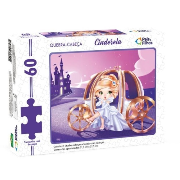 Detalhes: Quebra-Cabeça Cinderela / Embalagem contém: 1 Quebra-Cabeça cartonado com 60 peças / Dimensões aproximadas: 31,5cm x 22,5cm / Idade: + 4 anos / Produto Certificado INMETRO – Registro 003755/2019.