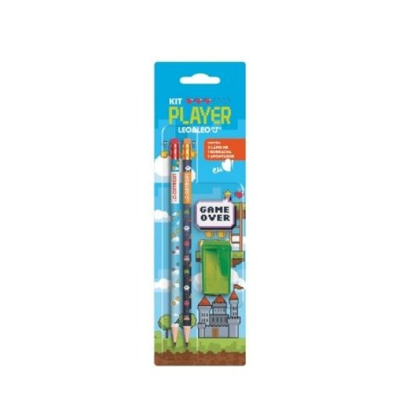 .Kit Player completo com 2 lápis HB + 1 apontador + 1 borracha / Apontador com depósito lamina em aço inox/ Borracha livre de pvc e sustentável / Registro Inmetro:006910/2020