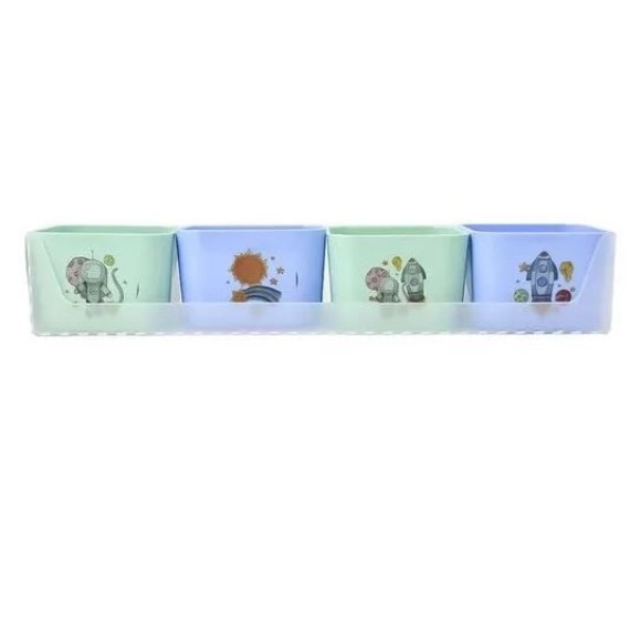 Especificações: Kit mundo da lua 1 suporte com 4 mini porta objetos / Suporte fabricado em plástico polipropileno / Porta objetos fabricados em plástico poliestireno / Suporte possui furos para fixação na parede / Acompanha cartela com 12 adesivos mundo da lua para personalizar os porta objetos / Acomoda diversos tipos de materiais pequenos / Dimensões: 310 x 85 x 55mm.