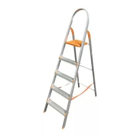 Escada 100% em alumínio / Patamar e acessórios em polipropileno / Fita de segurança / Sapatas antiderrapantes / Carga máxima de até 120 Kg / 5 Degraus (sendo 4 degraus + patamar) / Altura aberta: 159cm / Altura do patamar: 113 / Altura fechada: 168cm / Registro Inmetro: 003692/2023.
