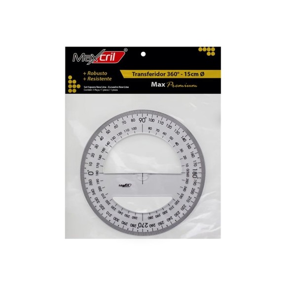 Perfeito para medições angulares, o transferidor 360º com 15cm de diâmetro oferece leitura clara e precisa de todos os ângulos. Sua escala bem definida facilita a visualização, permitindo resultados exatos tanto para iniciantes quanto para profissionais experientes. Registro Inmetro: 004398/2020