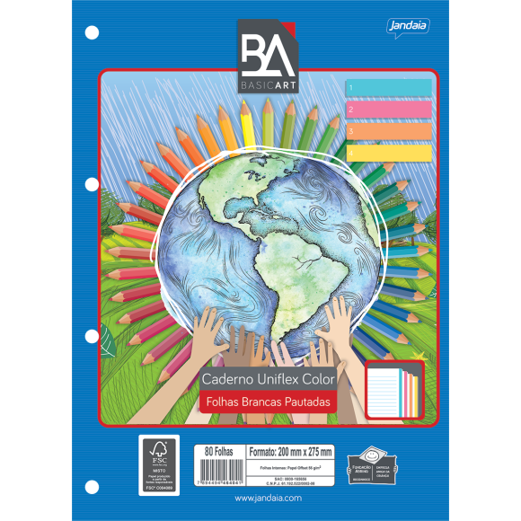Detalhes: Folhas coladas / Folhas pautadas / Bordas coloridas / Formato: 200mm x 275mm / Gramatura: 56g/m² / 96 Folhas.