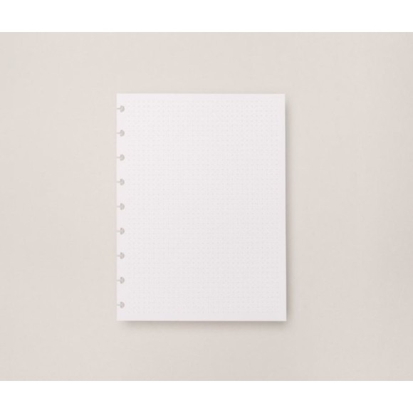 Mais uma das muitas opções de refil são as folhas pontilhadas. Elas servem para você construir seus conteúdos com muita liberdade, mas com uma base de pontinhos para guiá-lo. Ou seja: elas podem servir de estrutura para linhas, quadrados com lembretes, designs inspirados no modelo Bullet Journal e muito mais / O refil vem com 30 folhas de 120g