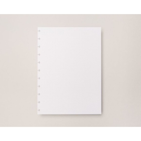 Mais uma das muitas opções de refil são as folhas pontilhadas. Elas servem para você construir seus conteúdos com muita liberdade, mas com uma base de pontinhos para guiá-lo. Ou seja: elas podem servir de estrutura para linhas, quadrados com lembretes, designs inspirados no modelo Bullet Journal e muito mais / O refil vem com 30 folhas de 120g / Tamanho: 200mm x 275mm.