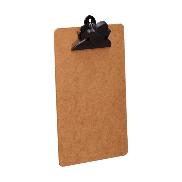 Prancheta em chapa de Eucatex com prendedor de plástico / Tamanho: 1/2 Ofício / Medidas: 235mm x 160mm.