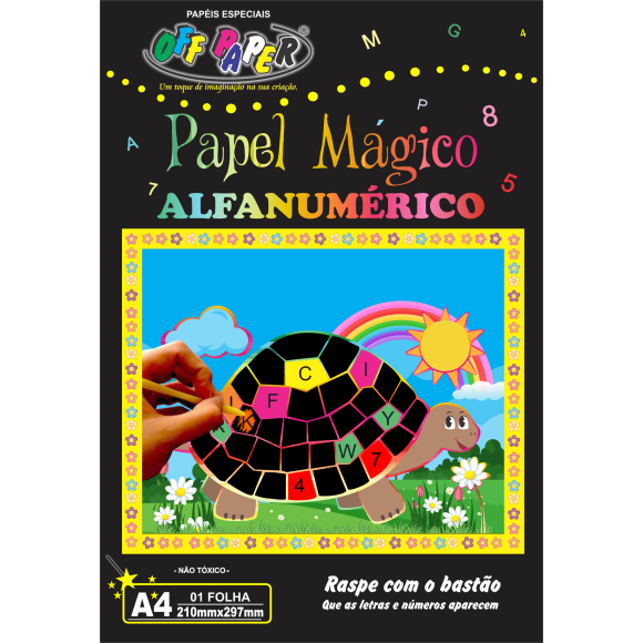 Raspe com o bastão arranhando a superfície e surpreenda com as letras, números e com a imagem colorida
