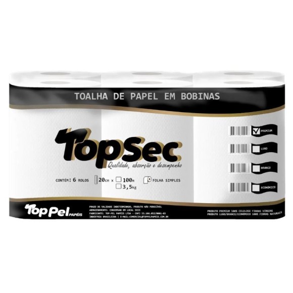 Papel toalha bobina / Fardo com 6 rolos / Medidas: 20cm x 200m / Composição: 100% fibras virgens.