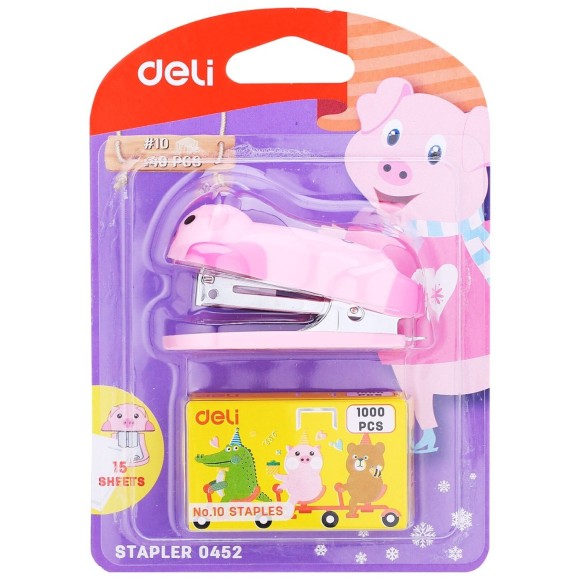 Detalhes: Mini grampeador Deli bichinhos / Utiliza grampos Nº10 / Grampeia até 12 folhas / Removedor de grampo integrado / Embalagem contém: 1 grampeador mini e 1 caixa de grampos.