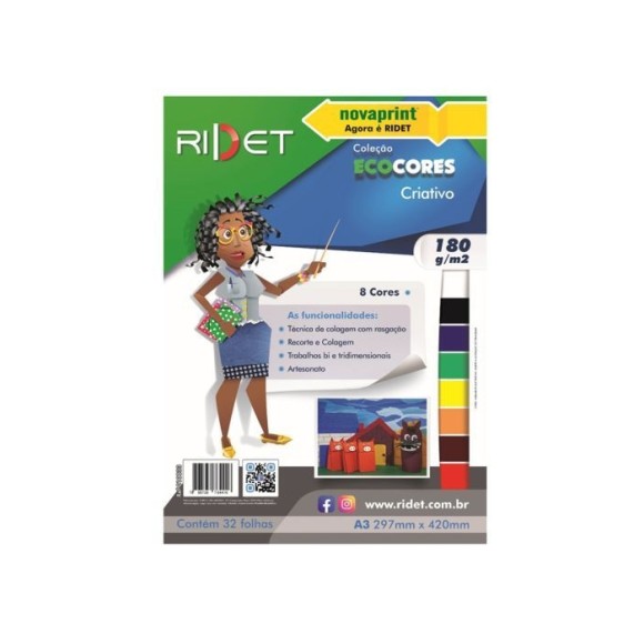 Detalhes: Bloco Ecocores Criativo / Funcionalidades: técnica de colagem com rasgação, dobradura, recorte e colagem / Embalagem contém 32 folhas / 8 Cores: branco, preto, azul escuro, verde, amarelo, laranja, marrom e vinho / Formato: A3 (297mm x 420mm) / Gramatura: 180g/m².