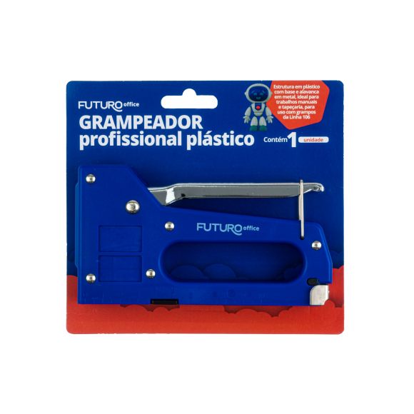 Estrutura em plástico com base e alavanca em metal, ideal para trabalhos manuais e tapeçaria. O Grampeador Profissional Plástico Futuro é perfeito para você que busca performance e confiança. Feito com um acabamento de primeira, o grampeador é ideal para profissionais que buscam grampeadores com desempenho acima da média para artesanato, colocação de carpetes, forrações, etc. Para uso com grampos da Linha 106.