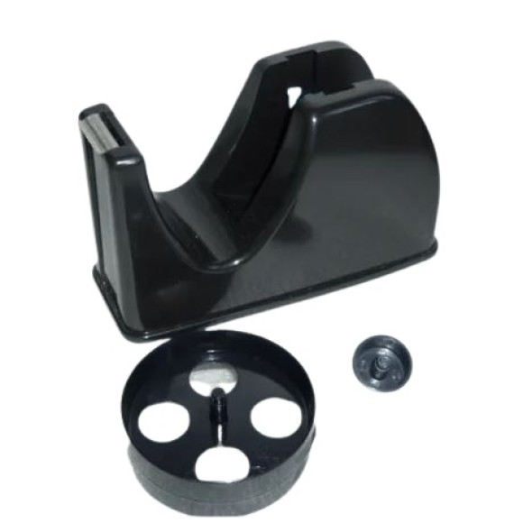 Suporte de fita adesiva grande / Contém 01 (uma) rodela pequena para adaptar fita adesiva pequena e 01 (uma) rodela grande para adaptar fita adesiva grande / Medidas: 22cm x 9cm x 8cm / Cor: Preto
