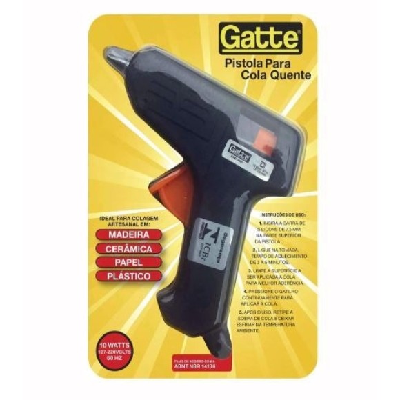 Bivolt – 10 Watts (127-220Volts – 60hz) / Usa bastões de cola de silicone diâmetro 7.2 mm / Indicado para colagem de papel, plástico, madeira, tecido, entre outros / Mais qualidade na realização de trabalhos manuais / Informações: Corpo injetado em plástico / Ponta metálica / Acompanha 2 bastões de cola de silicone – Diâmetro 7.2mm / Produto certificado no Inmetro. Plug de acordo com a ABNT NBR14136 / OCP: 0133