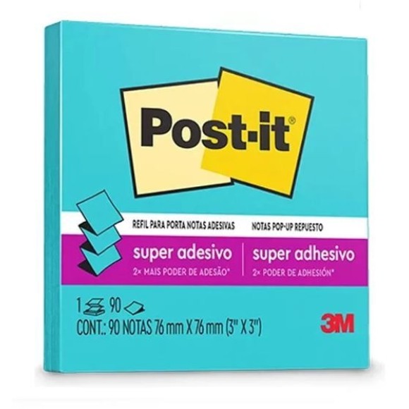 Especificação: Bloco autoadesivo removível POP UP Paraíso Azul / Bloco com 90 folhas / Tamanho do bloco: 76mm x 76mm / O bloco de notas adesivas Post-it refil para o sistema puxa fácil tem o formato parecido com uma sanfona.