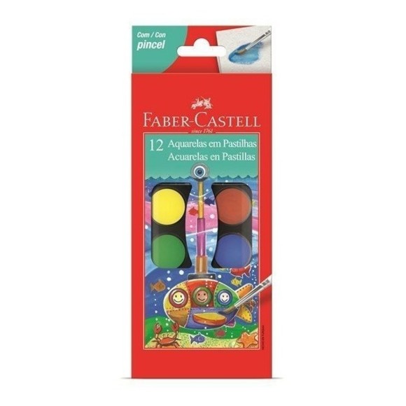 A Pastilha de Aquarela da Faber-Castell é perfeita para soltar a criatividade. Com 12 lindas cores e um pincel que acompanha o estojo, você pode misturar as cores e se divertir. Embalagem contém: Estojo com 12 Cores + 1 Pincel. Produto Certificado INMETRO (Artigo Escolar/Segurança) – Registro 003638/2012