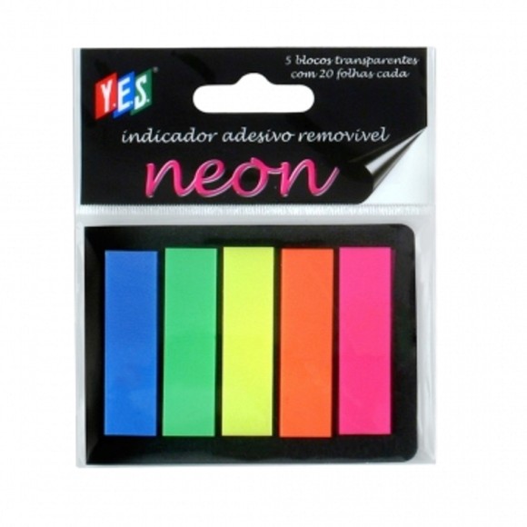 Marcador de Página Adesivo / 5 Cores Neon ( azul, verde, amarelo, laranja e rosa ) com 20 adesivos de cada cor / Modelo retangular / Permite escrita